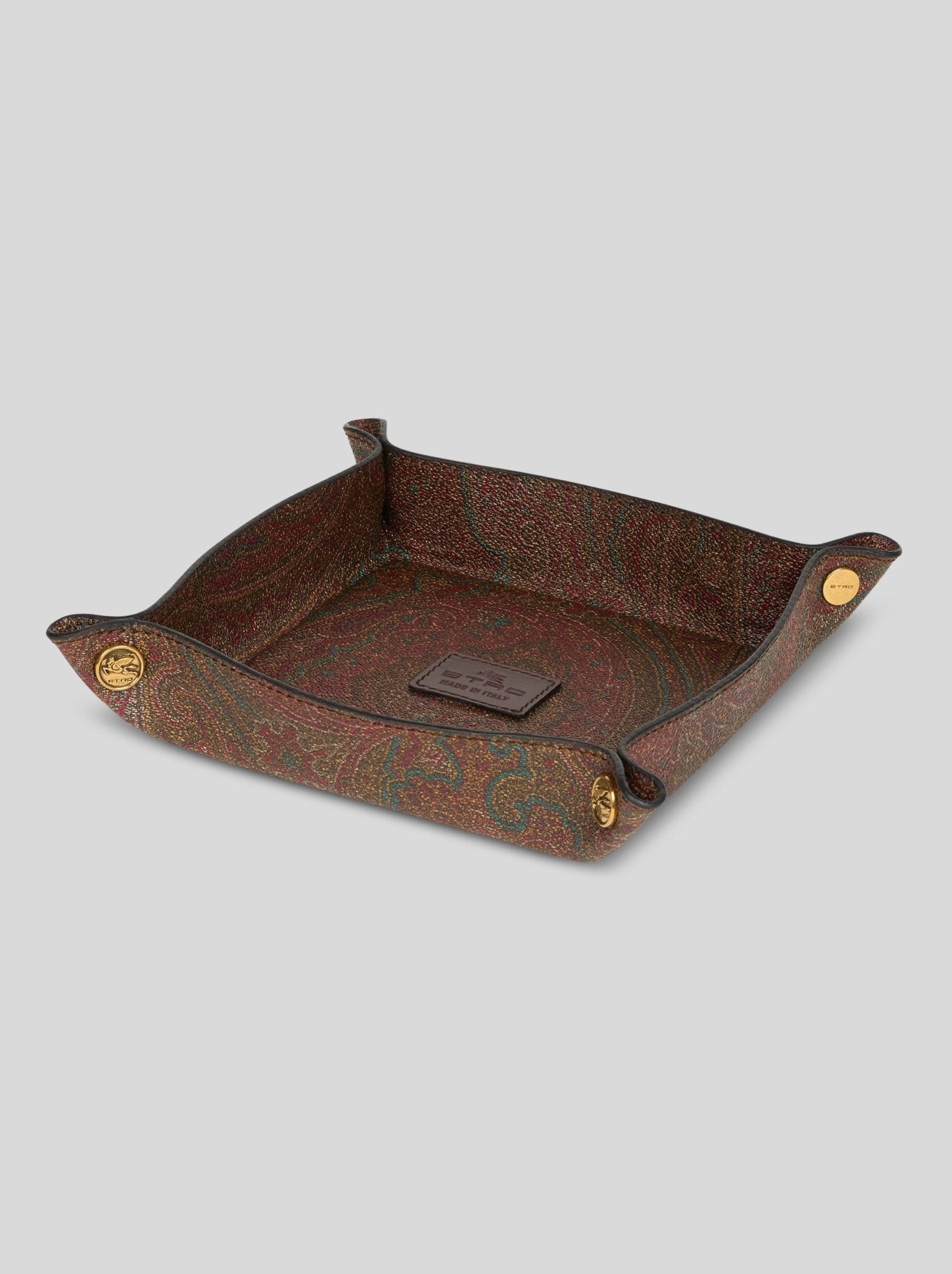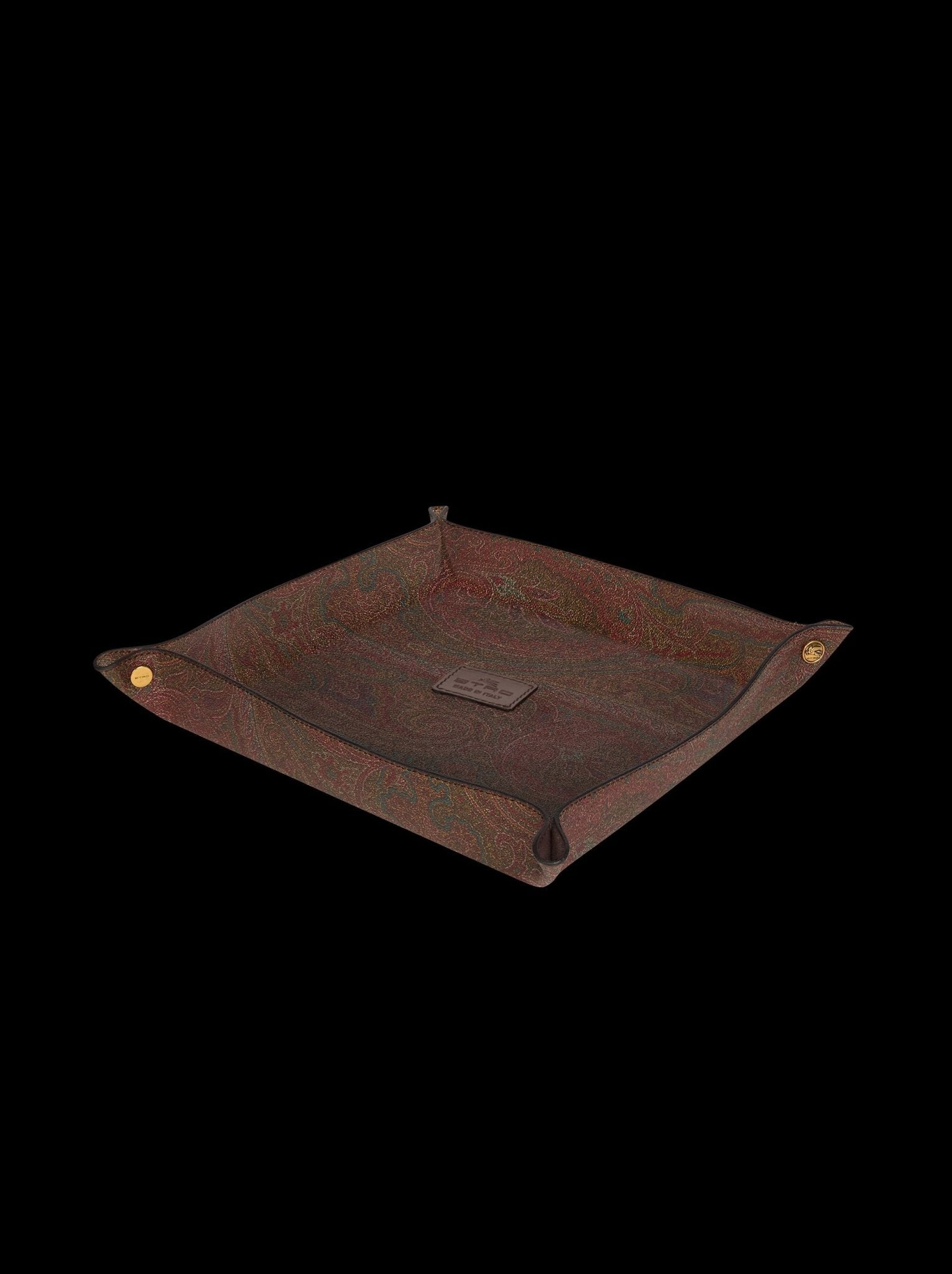 vassoi quadrati realizzati nell’iconico tessuto Arnica ETRO e monogramma pegaso.