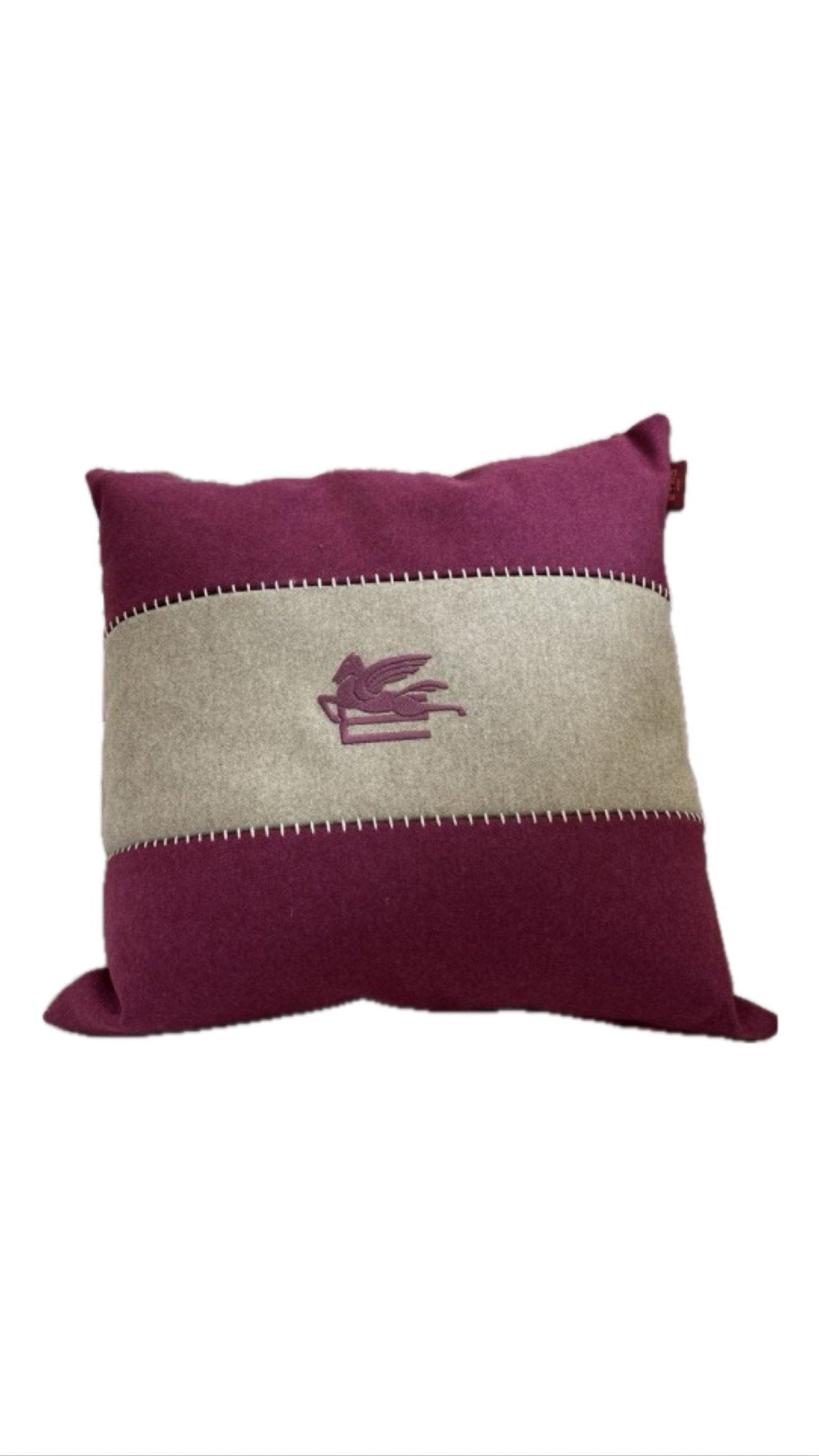 Cuscino bicolore caratterizzato da una banda centrale a contrasto rifinita da cuciture a punto cavallo e dal logo ETRO con l'iconico Pegaso ricamati a contrasto. Completa il design l'etichetta a bandierina ETRO.