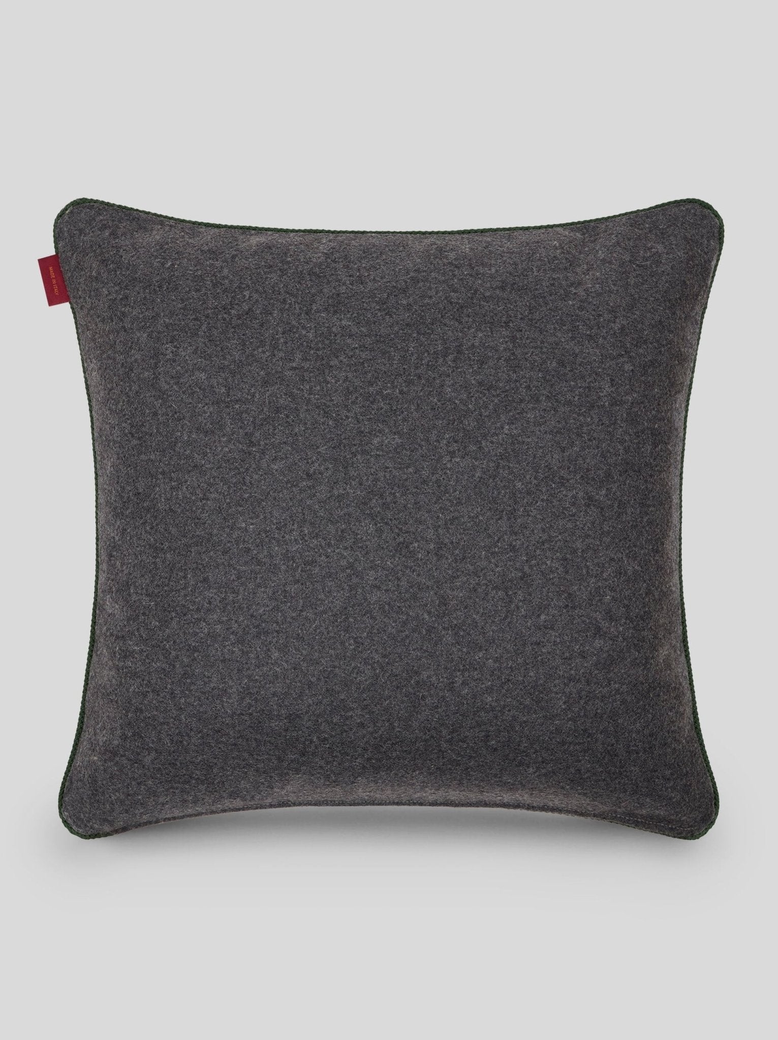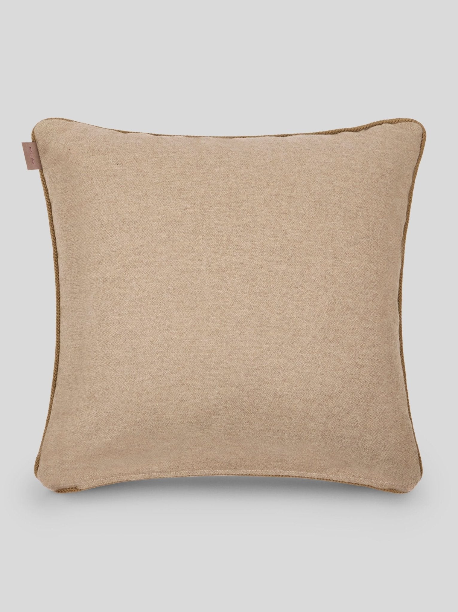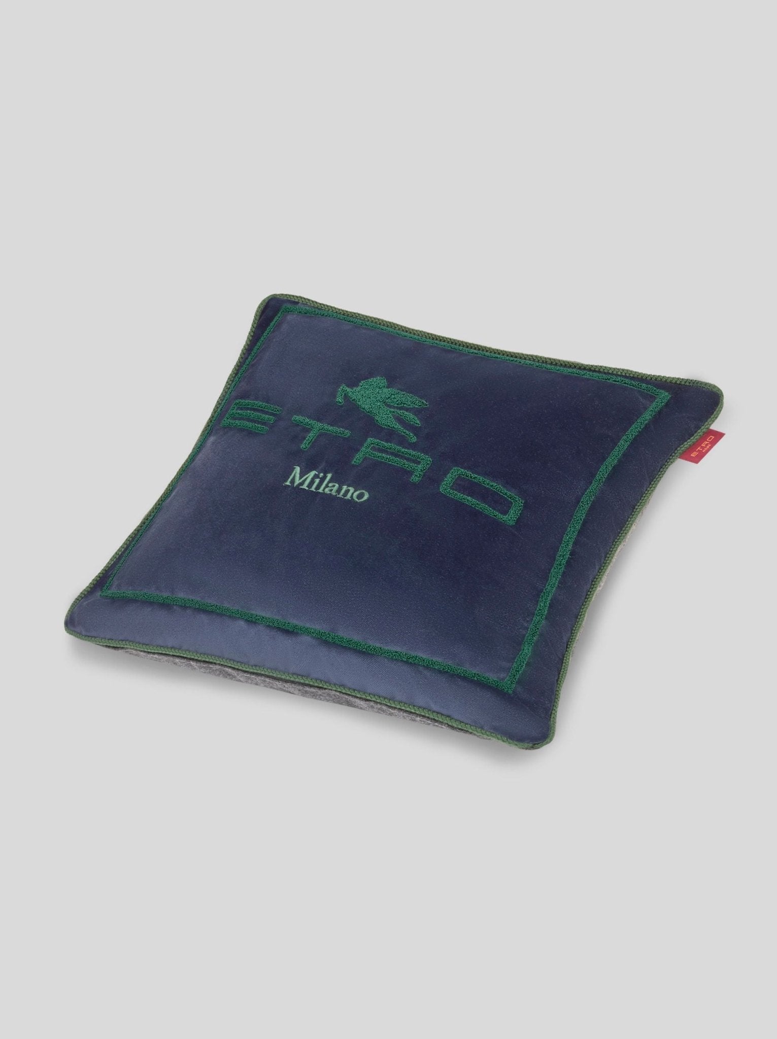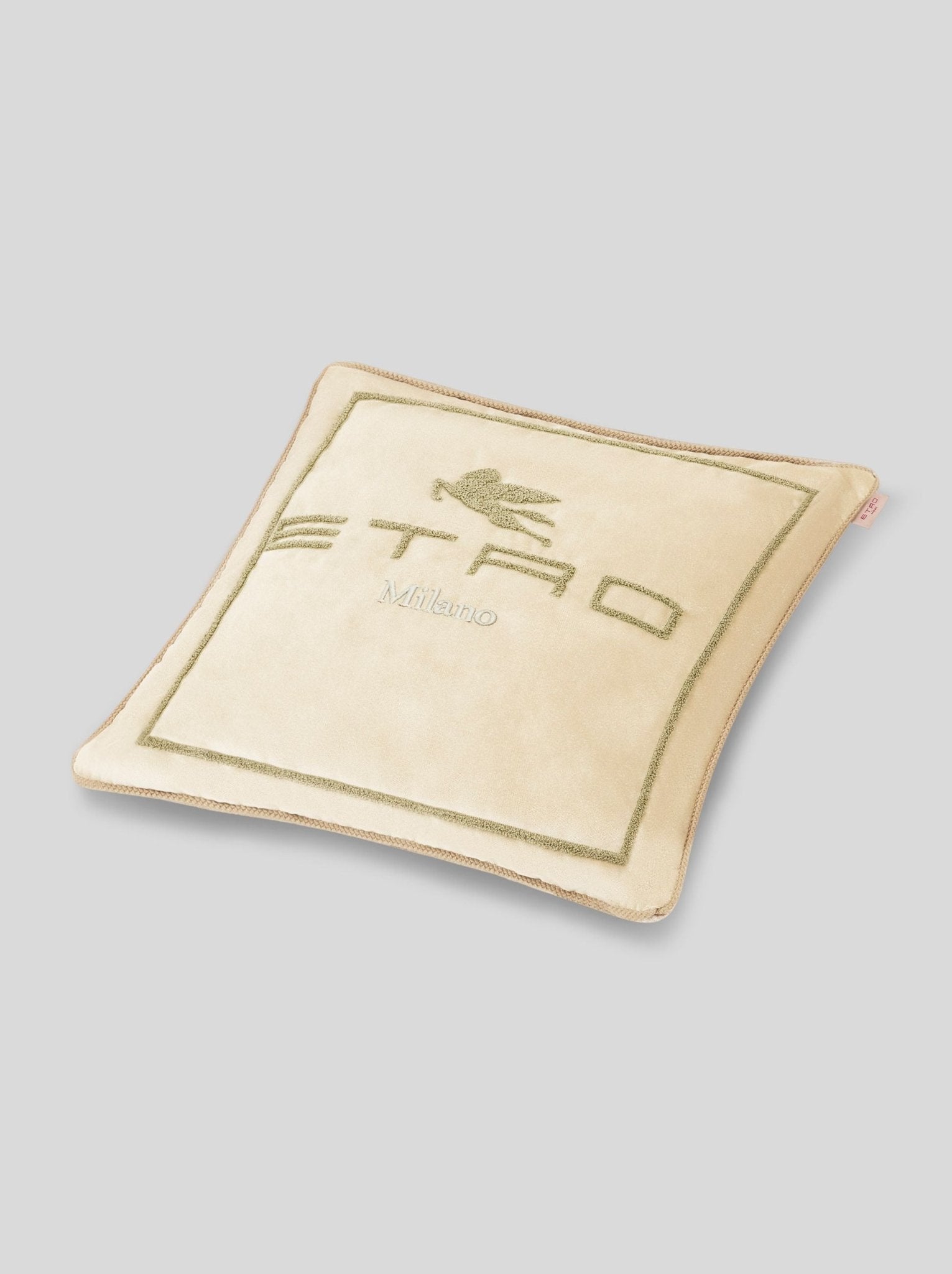Cuscino in cotone, decorato dalla scritta e dal Pegaso, il cavallo alato simbolo della Maison, presenta un profilo a constrasto.