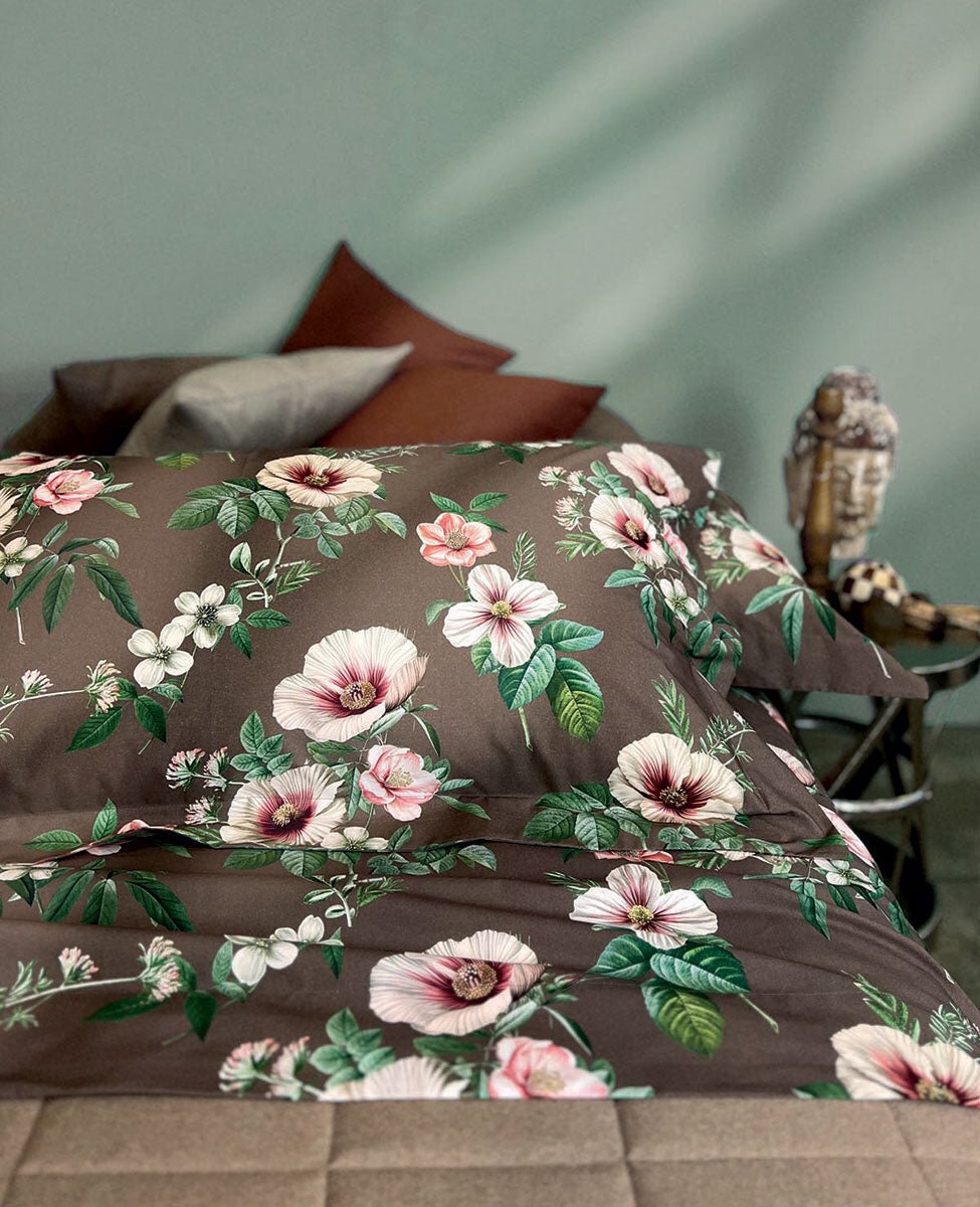 Completo lenzuola matrimoniale in raso con stampa all over, lenzuolo sotto in percalle tinta unita.