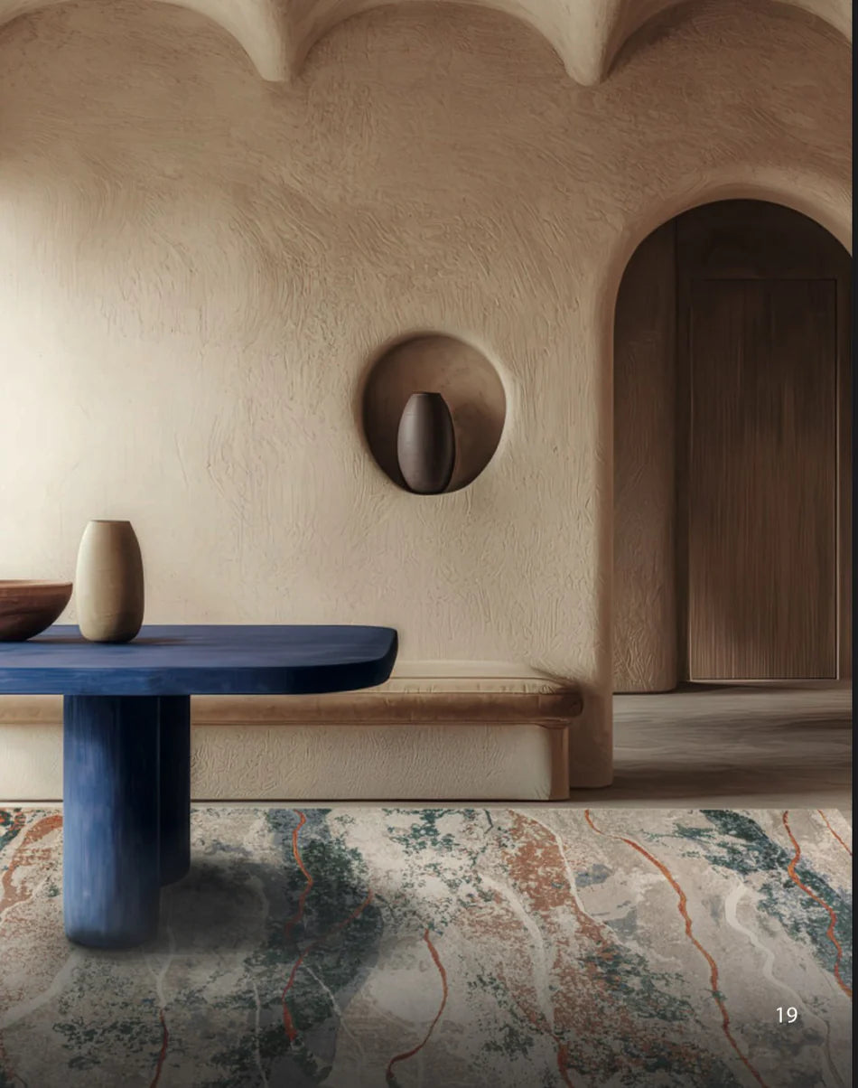 Il tappeto LAGUNA 83030/9262 raffigura nella foto una superficie dinamica e astratta: un fondo neutro si intreccia con onde sinuose in tonalità rame, blu petrolio e grigio perla. L'effetto visivo ricorda una mappa naturale, con venature e flussi che conferiscono profondità e carattere all’ambiente. Realizzato con produzione fatta a macchina, garantisce precisione nei dettagli e qualità costante.