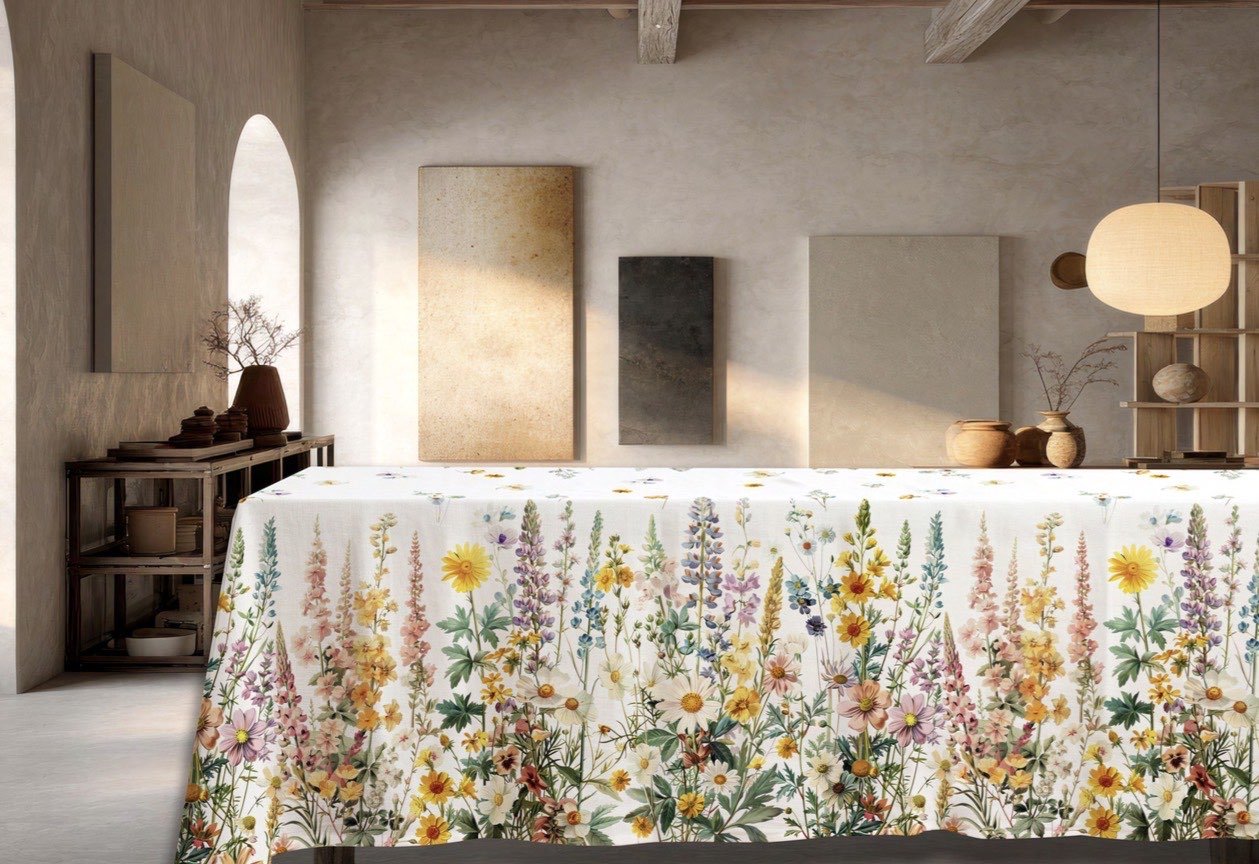 Il fondo chiaro color avorio è impreziosito da una splendida fantasia botanica che raffigura fiori di campo slanciati e delicati. Steli sottili, foglie leggere e fiori variopinti si sviluppano verso l’alto creando un effetto armonioso e naturale, come un piccolo prato fiorito che prende vita sulla tavola. 🌼🌸🌾