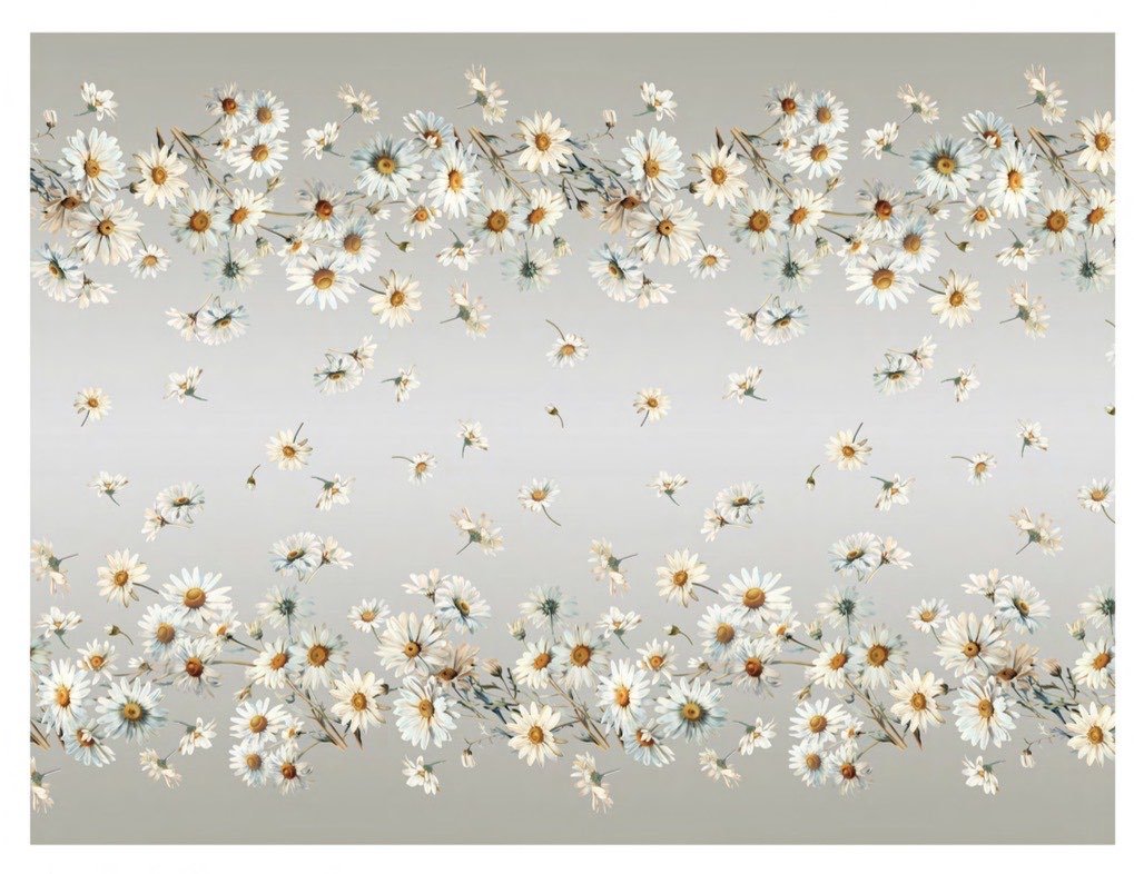 La fantasia presenta margherite bianche con centro giallo, distribuite con leggerezza lungo tutta la tovaglia. I fiori, dai toni naturali e armoniosi, sembrano quasi dipinti ad acquerello, creando un effetto fresco e primaverile. 🌼🌿