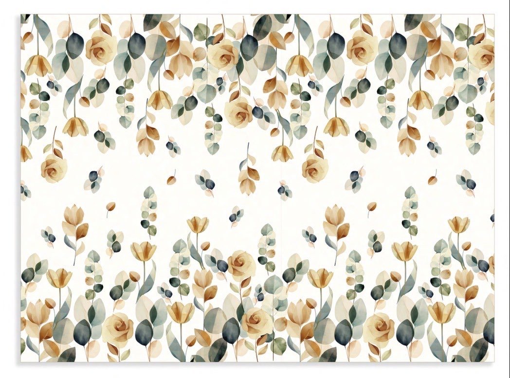 Il fondo chiaro color avorio accoglie una delicata fantasia floreale composta da fiori stilizzati, foglie e steli dalle linee morbide e moderne. I colori sono armoniosi e sofisticati: sfumature di verde salvia, beige, oro e terracotta, che creano un effetto leggero e rilassante. 🌿🌸