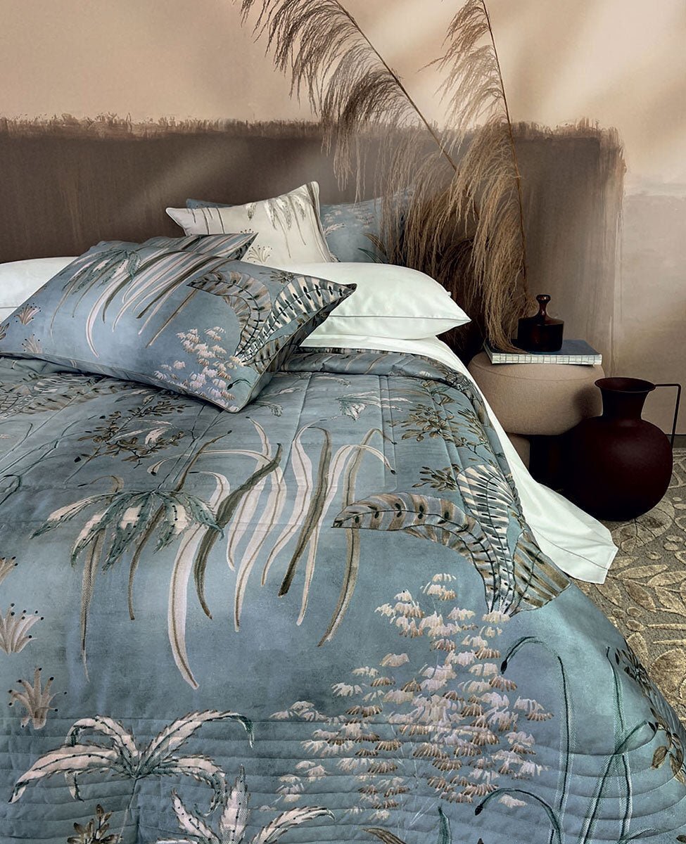 Fresco copriletto matrimoniale trapuntato con stampa all over su raso di cotone.