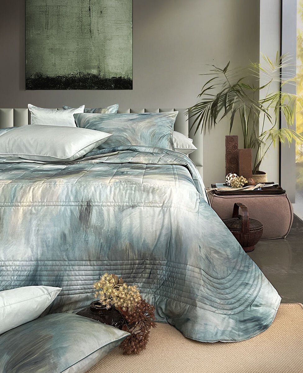Fresco copriletto matrimoniale trapuntato con stampa all over su raso di cotone.
