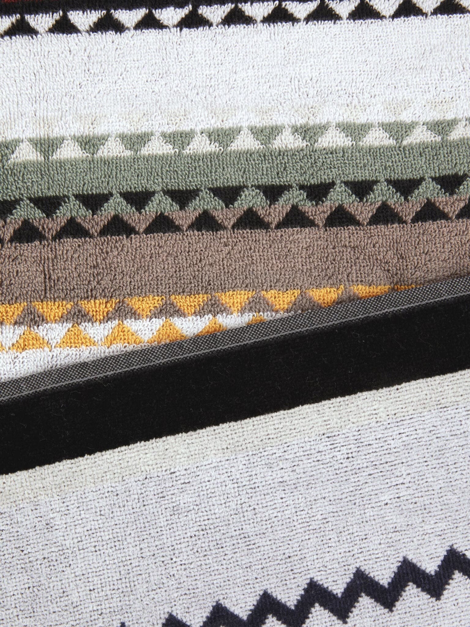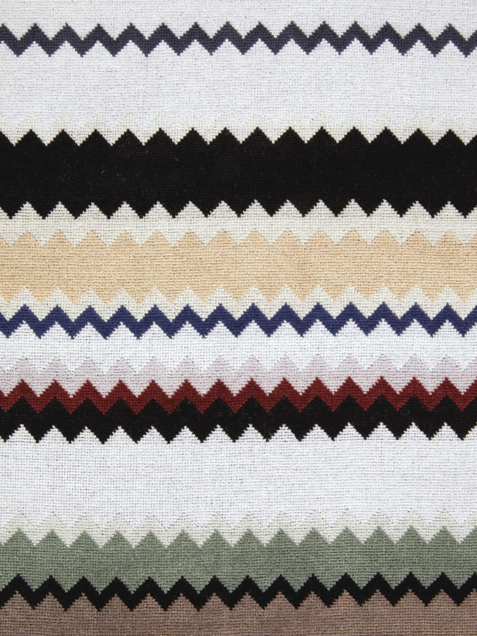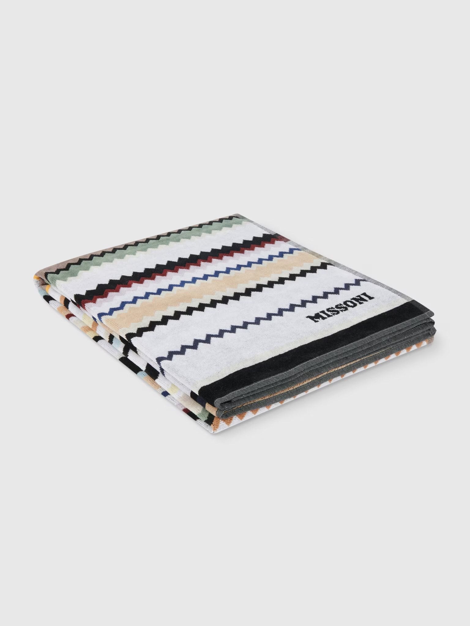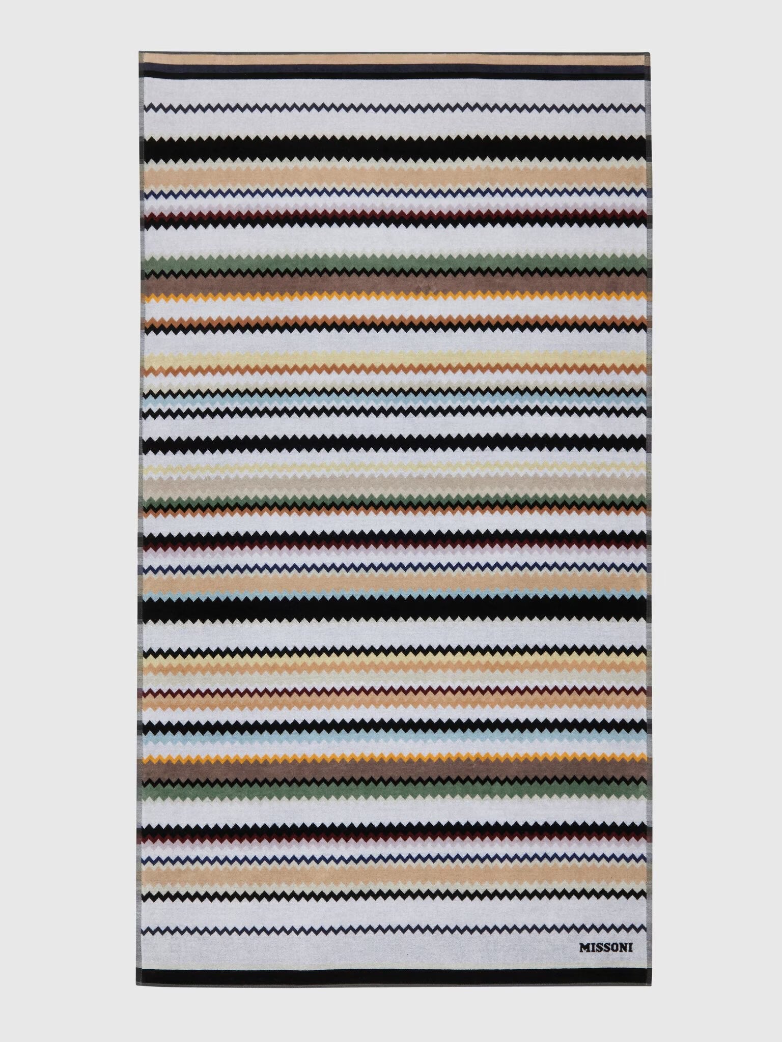 Il DNA MissoniHome si declina alla perfezione nel telo mare Curt 100x180 cm. La spugna di puro cotone velour, percorsa dal motivo a zig zag e caratterizzata dalla scritta logo, riveste questo accessorio estivo di stile senza tempo.