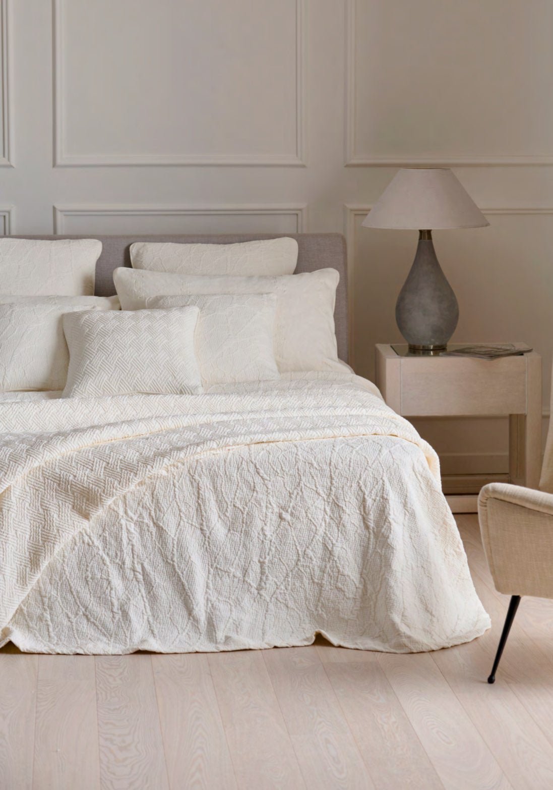 Copriletti realizzati in piqué di cotone jacquard, caratterizzati da una mano estremamente morbida. Il tessuto in cotone extra fine è sottoposto a uno speciale finissaggio in cesto che ne esalta ulteriormente