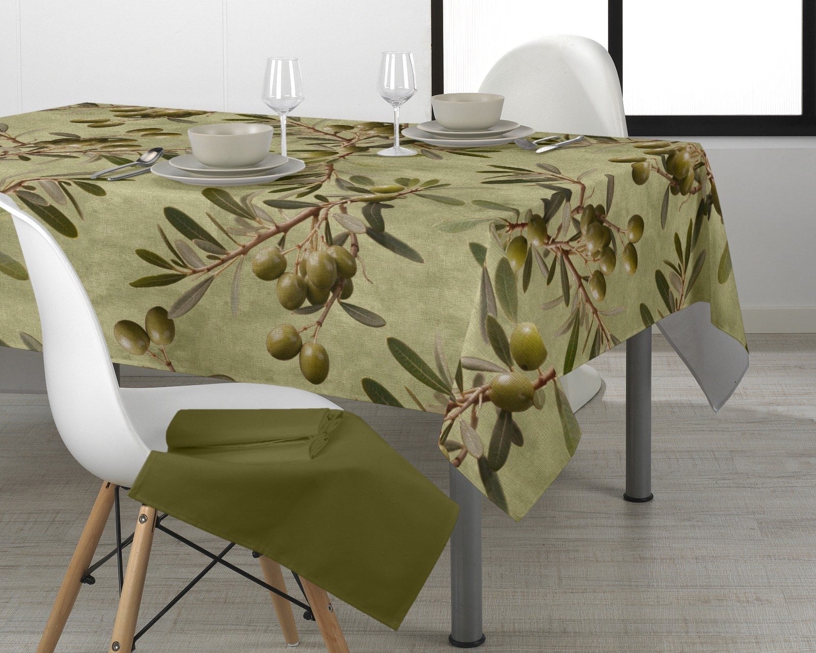 La tovaglia presenta un fondo color verde oliva chiaro con una stampa realistica di rami di ulivo ricchi di foglie e olive nelle tonalità del verde e del marrone. Il motivo decorativo è distribuito in modo armonioso su tutta la superficie, creando un effetto fresco e raffinato che richiama l’atmosfera mediterranea.