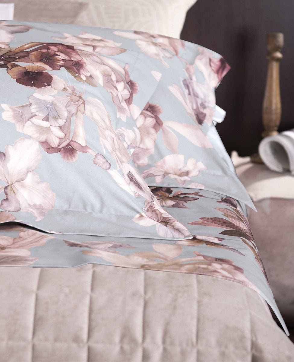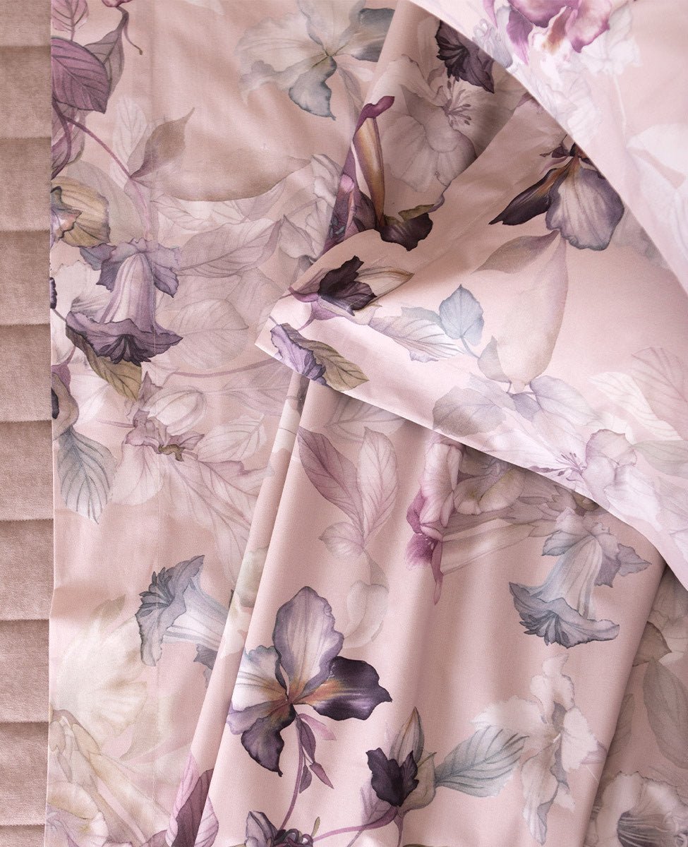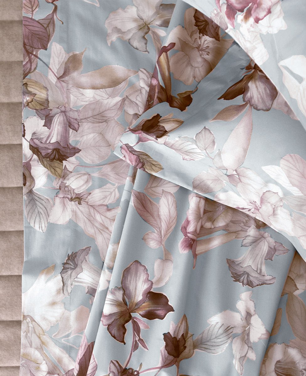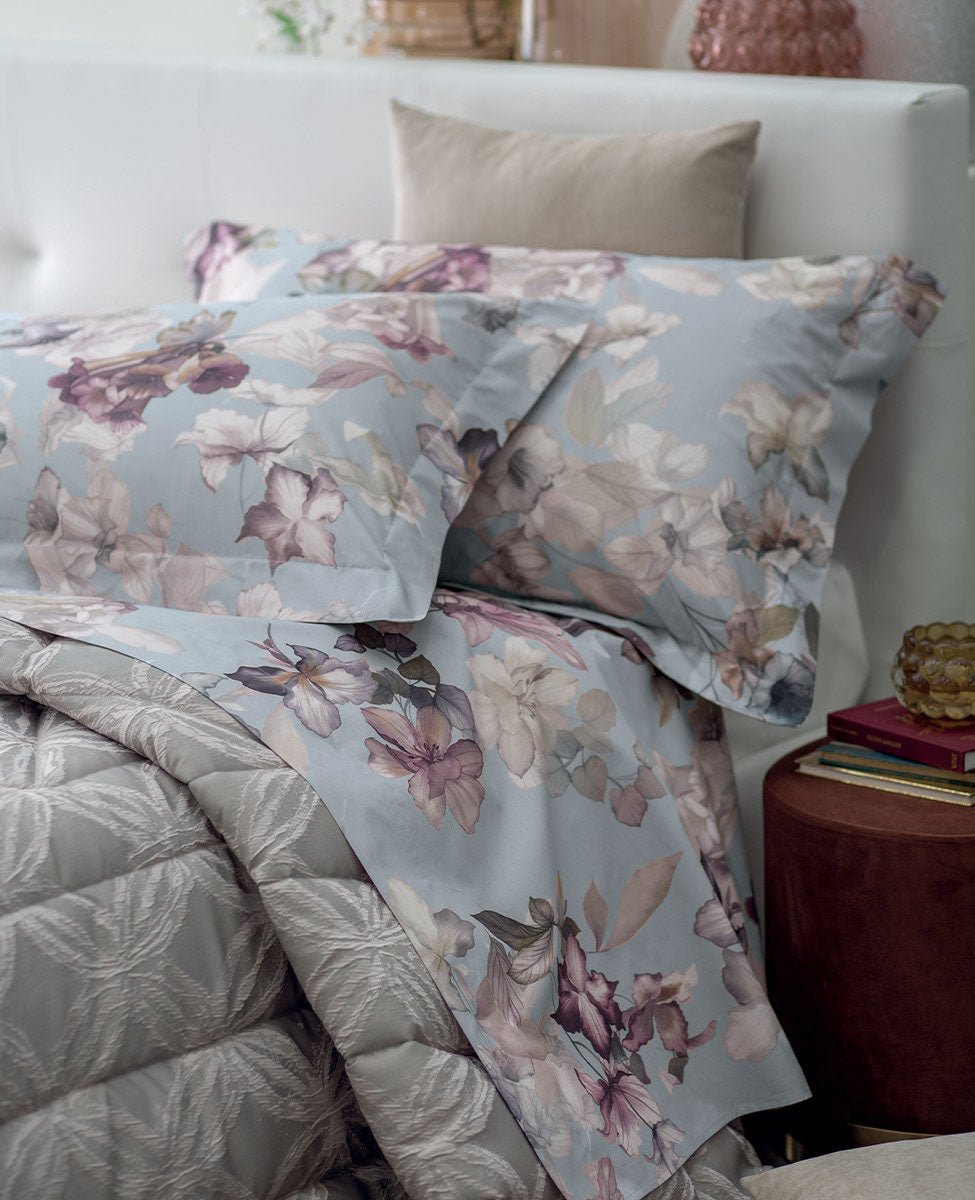 Double sheet set in printed cotton percale with bottom sheet in plain color percale.