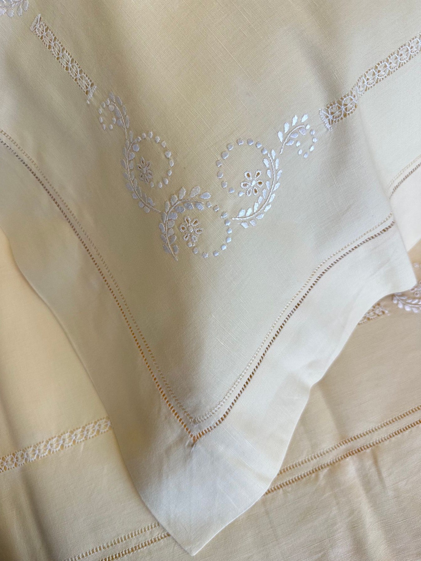 Un lenzuolo in lino con ricamo in seta e doppio punto a giorno è un capolavoro di artigianato tessile, caratterizzato da materiali di alta qualità e tecniche di ricamo sofisticate.