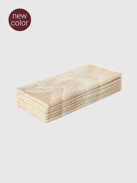 La firma stilistica della maison si esprime nel set di lavette Marea, composto da sei pezzi in tre diverse palette colore. Realizzate in puro cotone, sono caratterizzate dal motivo zig zag che dona ritmo e personalità all’accessorio, rendendolo una presenza raffinata negli spazi dedicati all’ospitalità.