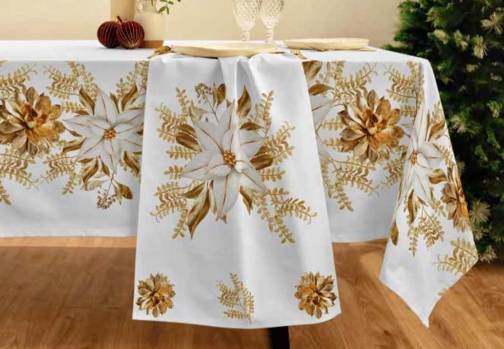 La tovaglia in cotone ci presenta un natale che manifesta la voglia di tradizione vista in chiave contemporanea.