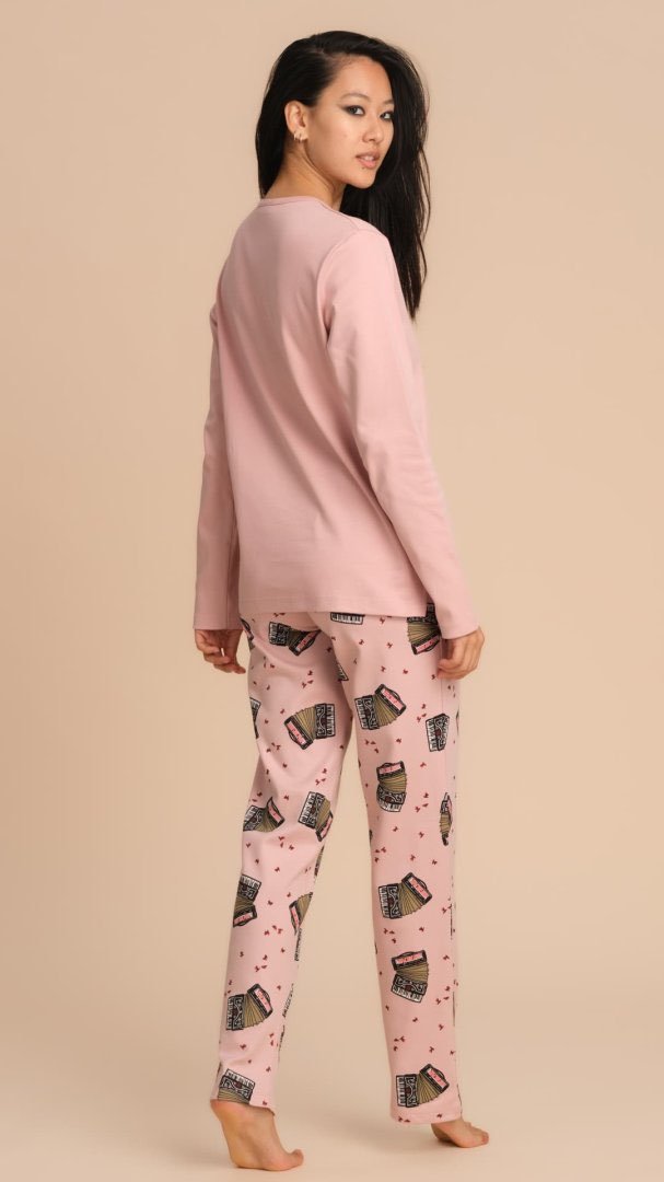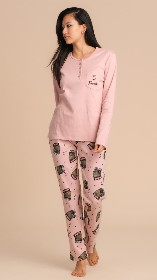 Il pigiama donna in caldo cotone interlock firmato Pepita è la scelta perfetta per affrontare le notti invernali con comfort, stile e un tocco di ironia. La maglia a maniche lunghe tinta unita con abbottonatura frontale è impreziosita da un elegante taschino con ricamo, mentre il pantalone lungo dritto è decorato con un’esclusiva stampa di fisarmoniche, ideata e realizzata da Pepita per la collezione ispirata alla musica. Un design originale che unisce tradizione e creatività, pensato per chi ama distinguersi anche nei momenti di relax. Realizzato in morbido caldo cotone interlock, questo pigiama invernale garantisce un avvolgente calore naturale senza rinunciare alla traspirabilità, regalando benessere e morbidezza a contatto con la pelle. La qualità del tessuto rende il capo resistente, confortevole e ideale per la stagione fredda, assicurando un sonno piacevole e rigenerante. Scegliere un pigiama Pepita in caldo cotone significa indossare un capo che unisce funzionalità e creatività, con dettagli ironici e raffinati che trasformano la pigiameria in un momento di stile. Un modello versatile, pratico ed elegante, perfetto per chi cerca un pigiama donna invernale comodo e originale, capace di esprimere personalità e leggerezza anche nelle serate più fredde.