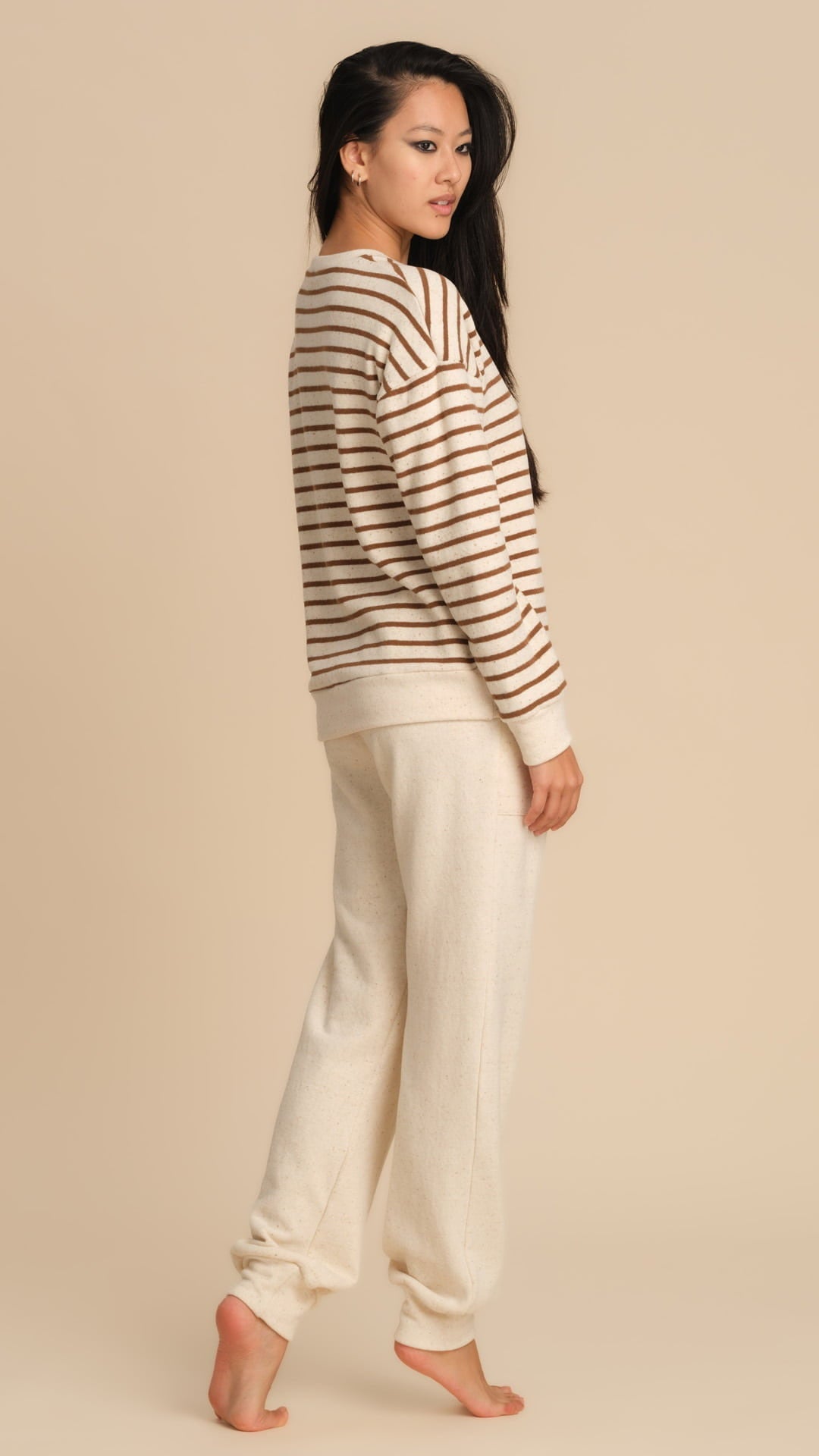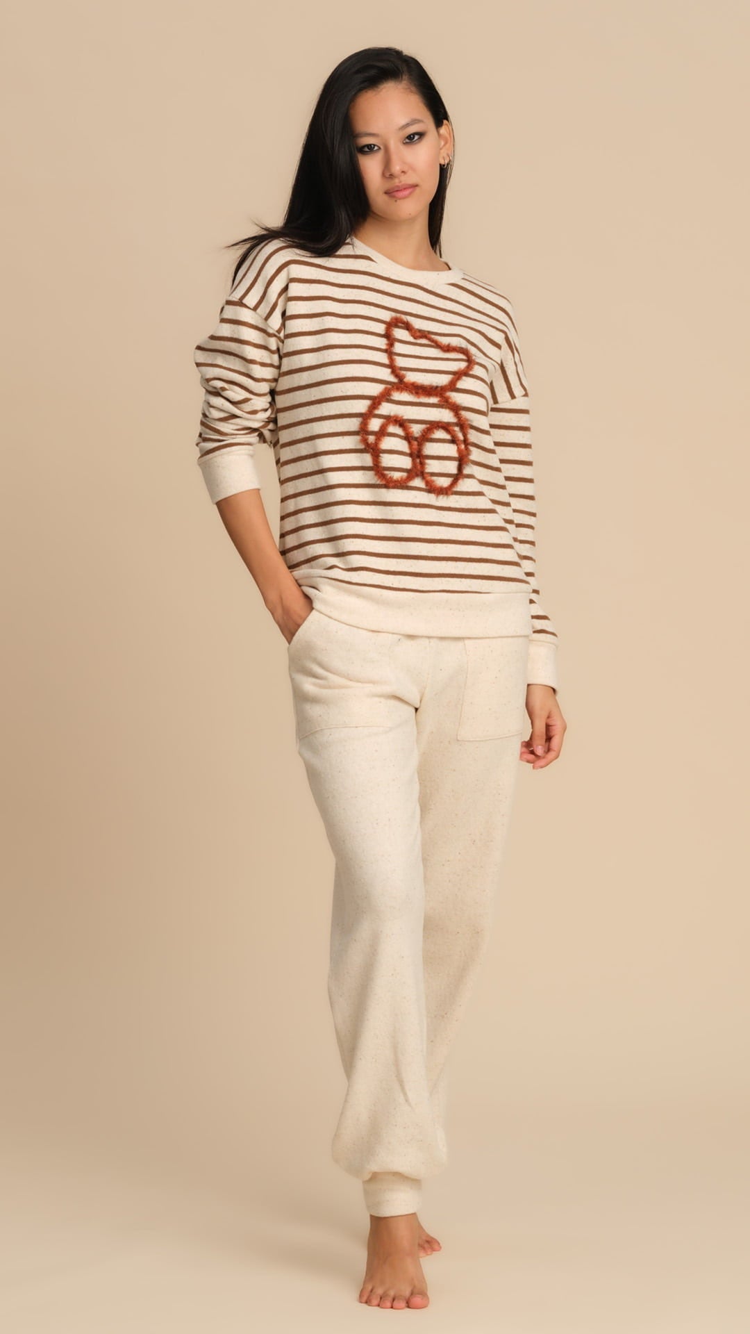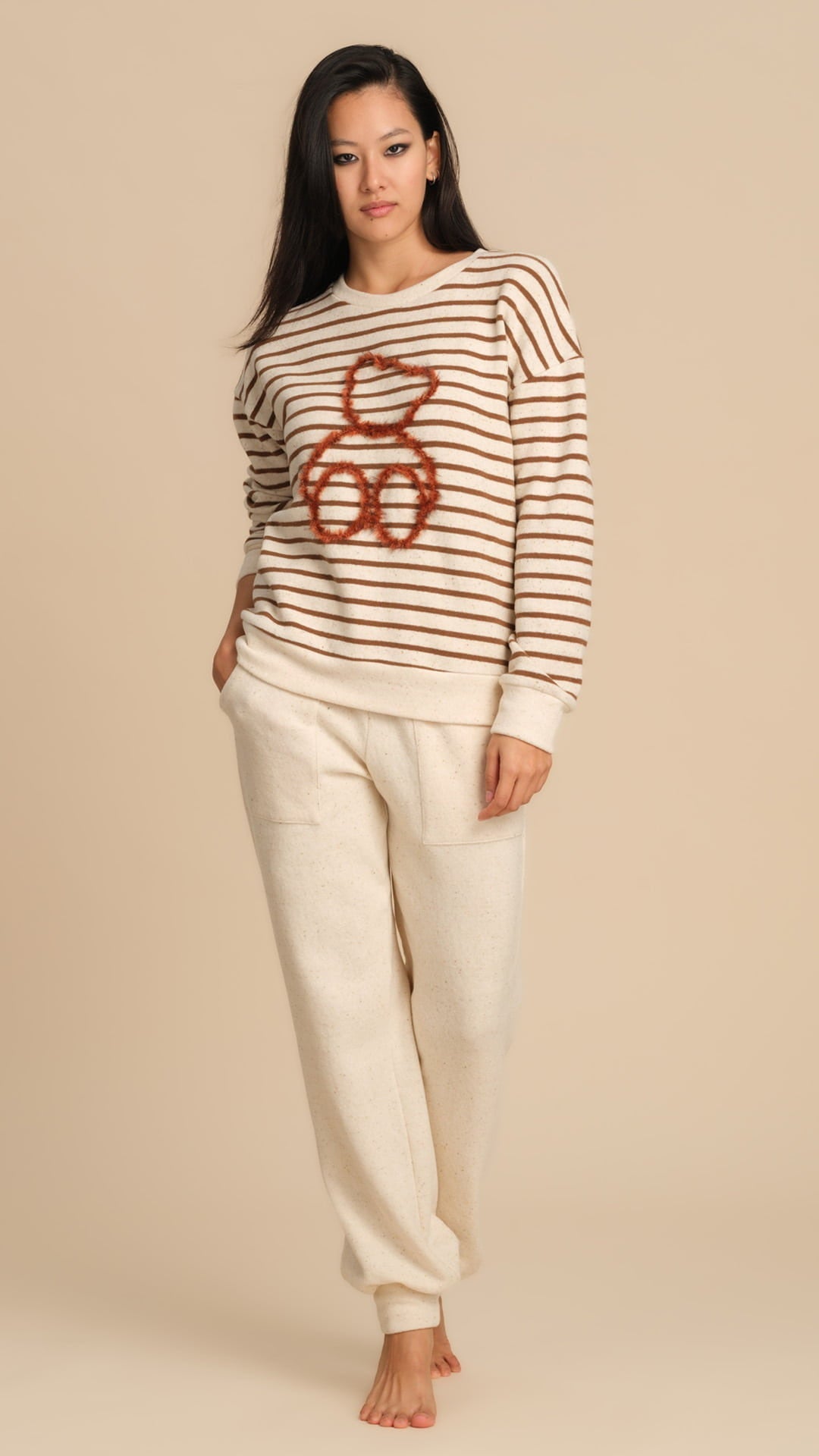 Rendi unico il tuo look da casa con questo completo donna in misto cotone, morbido, caldo e perfetto per l’homewear nella stagione autunno-inverno. Il tessuto di qualità garantisce comfort e una sensazione piacevole sulla pelle, ideale per il relax quotidiano. La maglia a maniche lunghe presenta righe sottili ed un adorabile orso ricamato con filo lurex, che aggiunge un dettaglio luminoso e originale. Il pantalone lungo color panna, dal taglio morbido con polsino alla caviglia, completa il completo donando uno stile casual ma curato. Un capo versatile che unisce comodità e stile, perfetto per trascorrere le giornate in casa con un tocco di femminilità e calore.