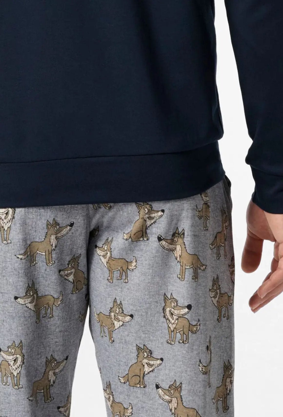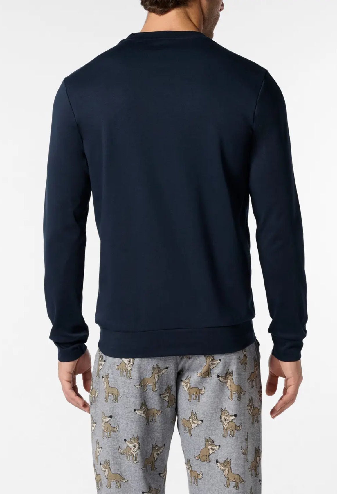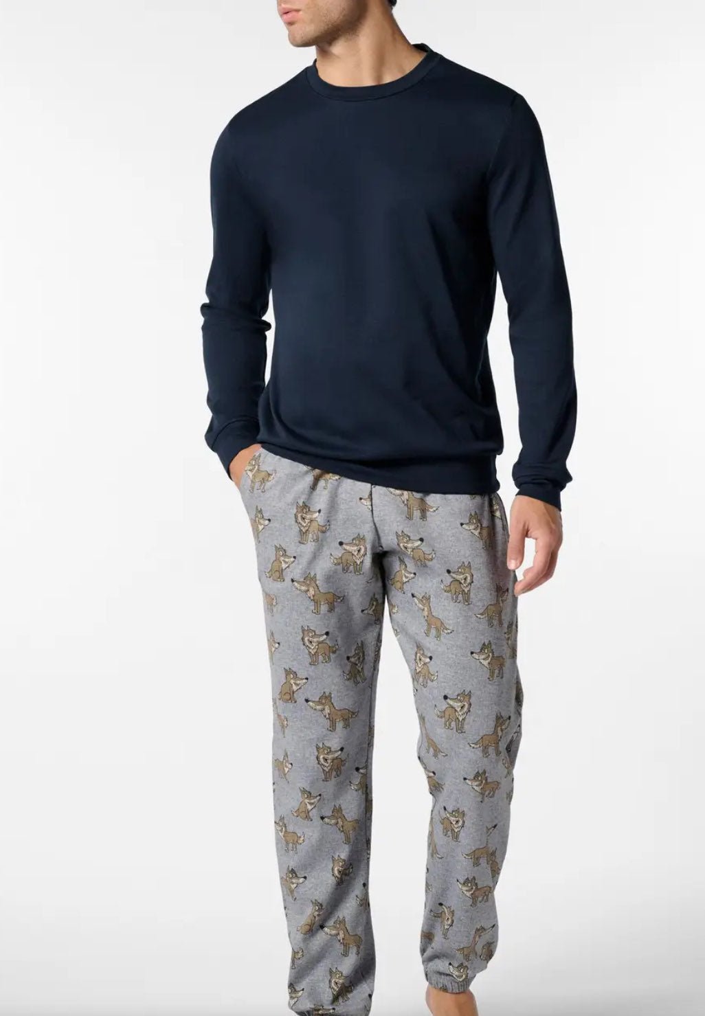 Pigiama lungo da uomo in caldo cotone invernale, con girocollo e finiture a costina su polsi e fondo maglia per offrire massimo comfort. I pantaloni con fantasia Lupo sono dotati di tasche laterali, coulisse regolabile in vita ed elastico alle caviglie per un look giovane e rilassato.