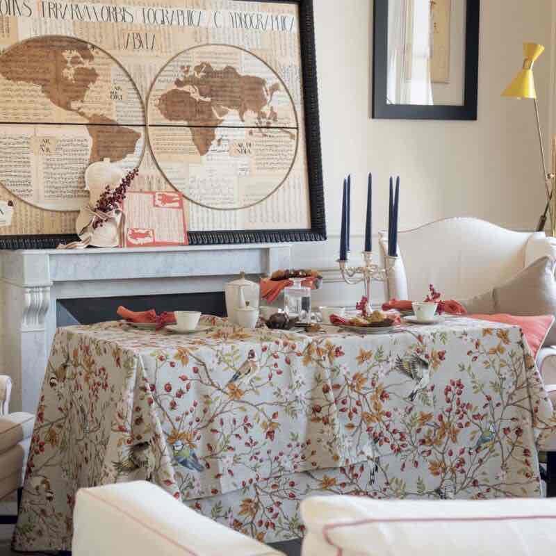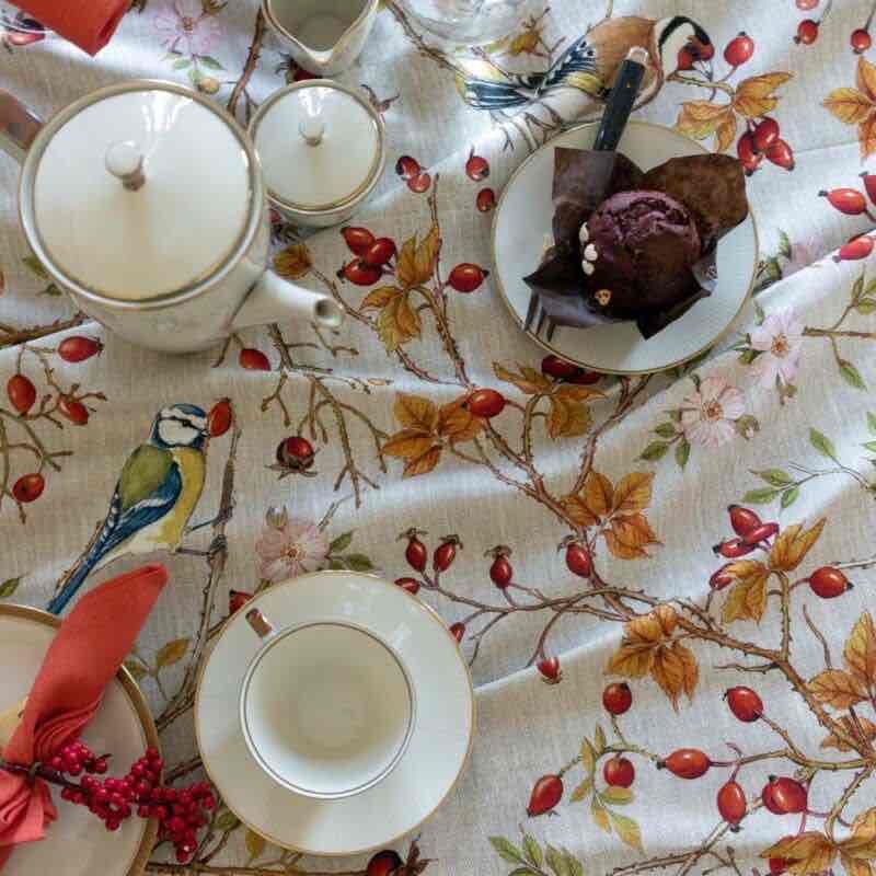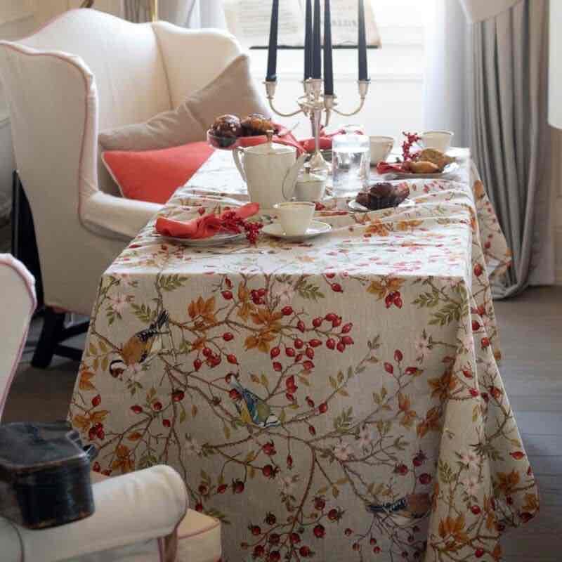 Cardellino tablecloth for 12 places 170x270 in 100% hemp and all over print.