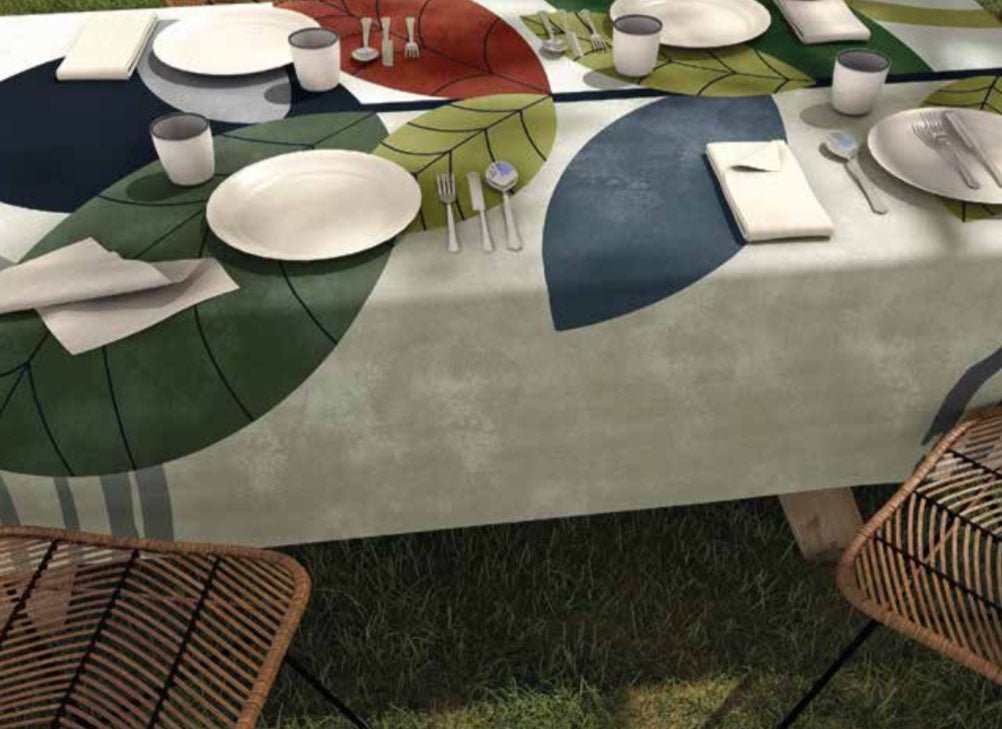 Tovaglia realizzata in 100% cotone panama antimacchia con stampa.