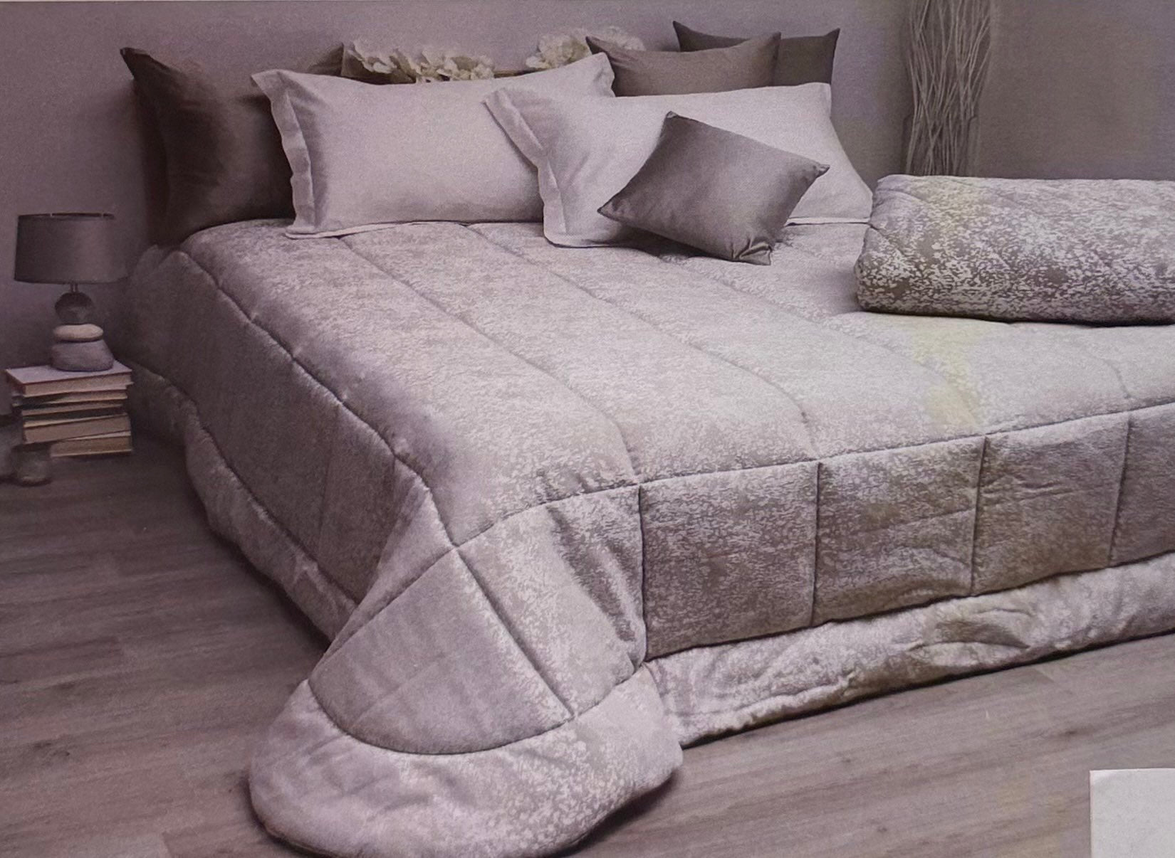 trapunta matrimoniale 260x270 imbottita con 350gr in fiocco di fibra anallergica realizzata capo per capo e ribattuta a mano, trapuntatura a quadri 30x30.