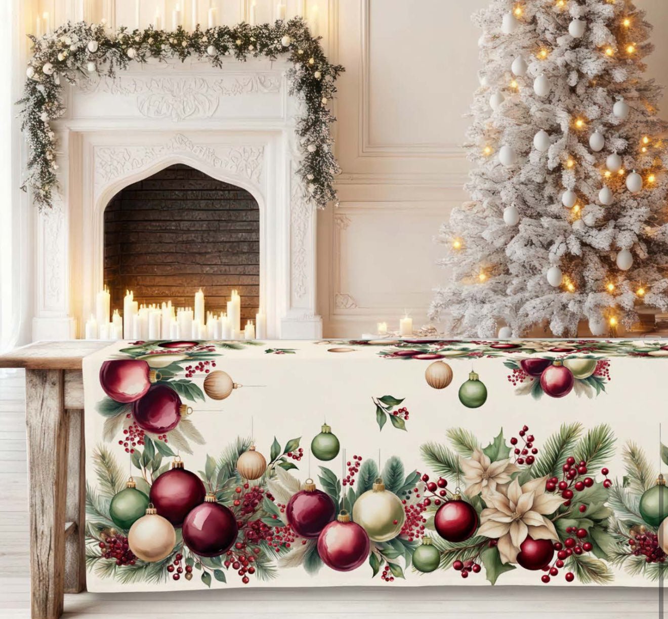 runner natalizio con stampa ADDOBBI, in 100% panama di cotone,rifinito con orlino alto.