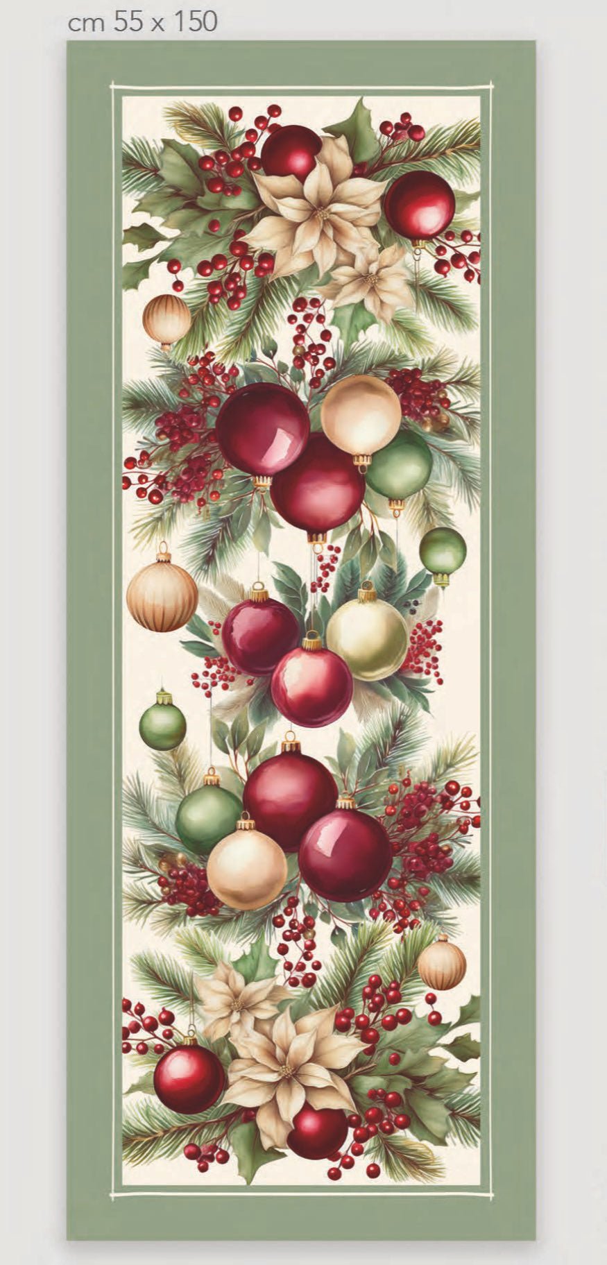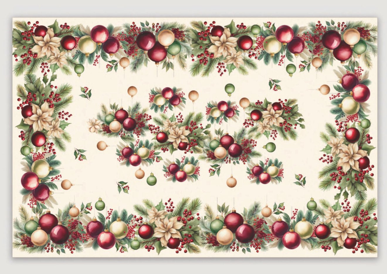 Tovaglia natalizia con stampa ADDOBBI, in 100% panama di cotone,rifinita con orlino alto.