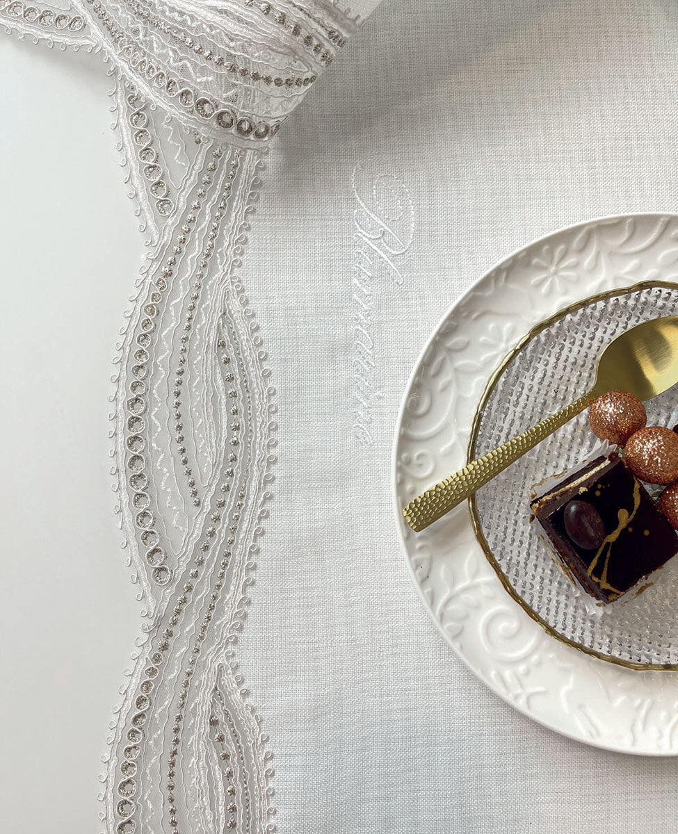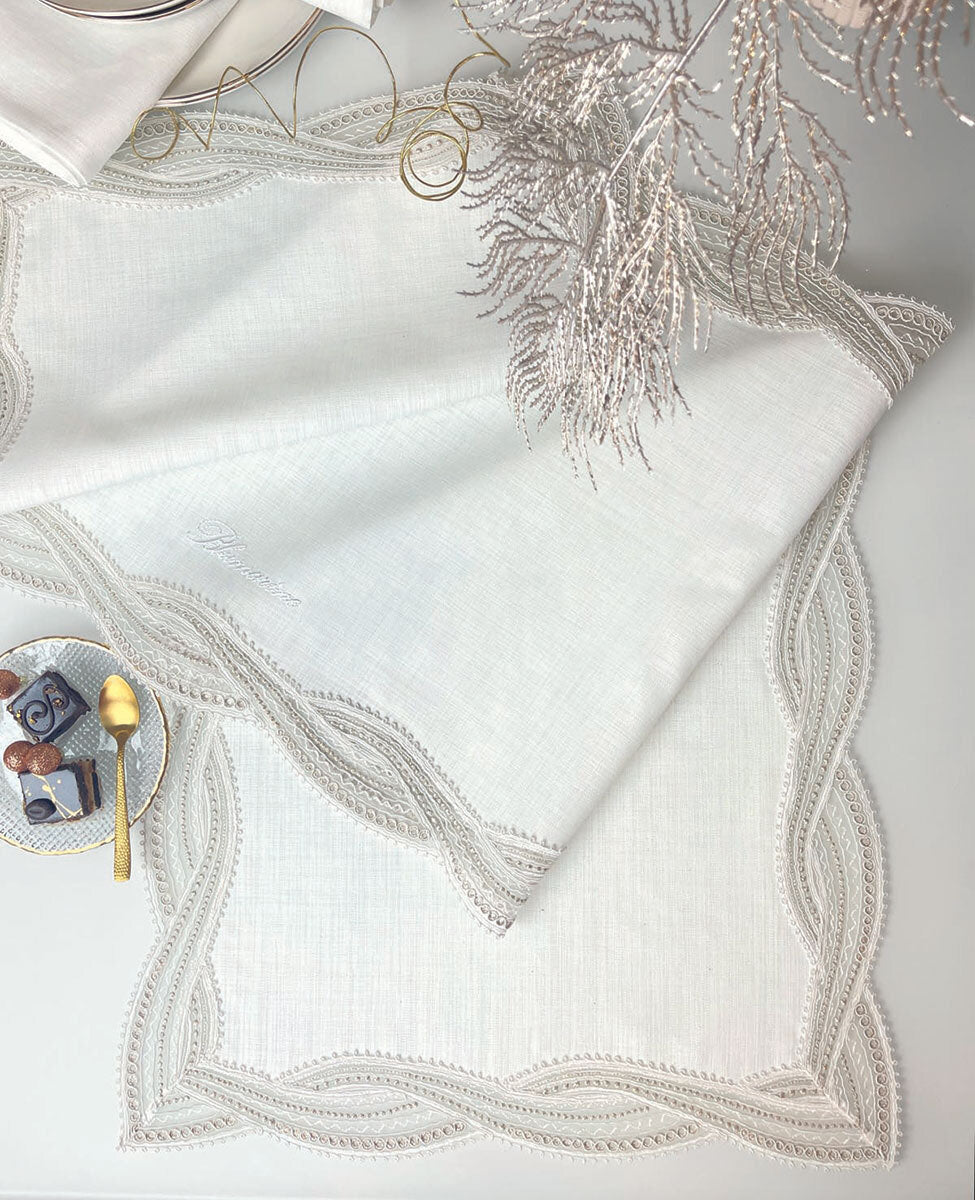 Runner con pizzo macramè rimesso ad intarsio su 4 lati. Logo Blumarine ricamato.